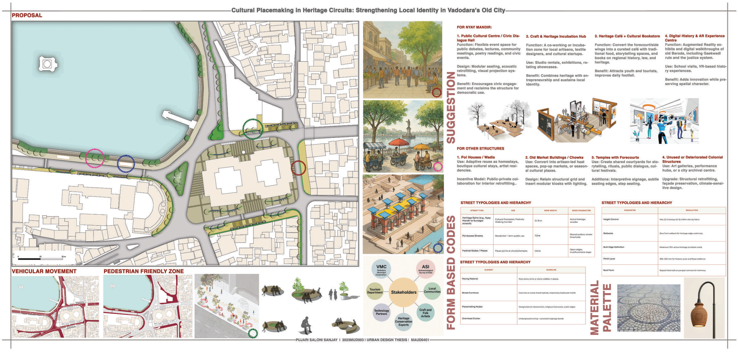 Vadodara’s old city, with its dense built fabric, rich architectural legacy; and culturally diverse communities, serves as the primary case for this exploration. The thesis analyzes how physical deterioration, traffic congestion, and loss of public space have impacted the lived experience and cultural expression of the area. Through extensive site studies, community interactions, and spatial analysis, the research identifies key urban issues and latent opportunities within the corridor.