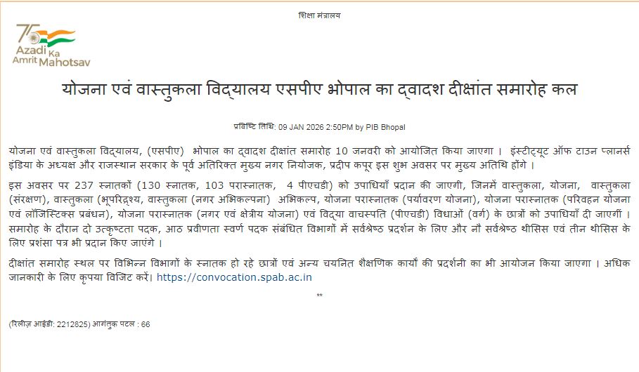 योजना एवं वास्तुकला विद्यालय एसपीए भोपाल का द्वादश दीक्षांत समारोह कल(12th Convocation of School of Planning and Architecture (SPA), Bhopal tomorrow)